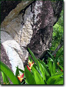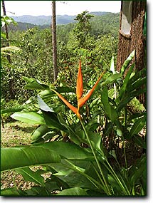 "Heliconia flowers beside the cabanas with the Mayan Mountains as a backdrop." |