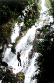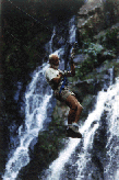 At El Chorro Macho this is accomplished by modifying techniques originally developed by "spelunkers" (cavers) and canyon rappelers. Safely strapped into a harness the descent is down a series of platforms in front of the fabulous El Macho wateralls complete with an inviting pool at the bottom for a refreshing swim. |
