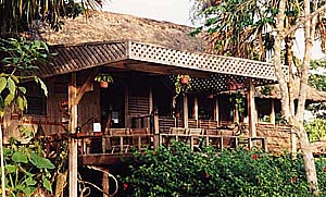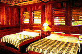 mainly mahogany. Each cabana has a palm thatched roof, en suite bathrooms with hot water, ceiling fan, 24 hour electricity and a verandah overlooking the tropical gardens and the lagoon. |